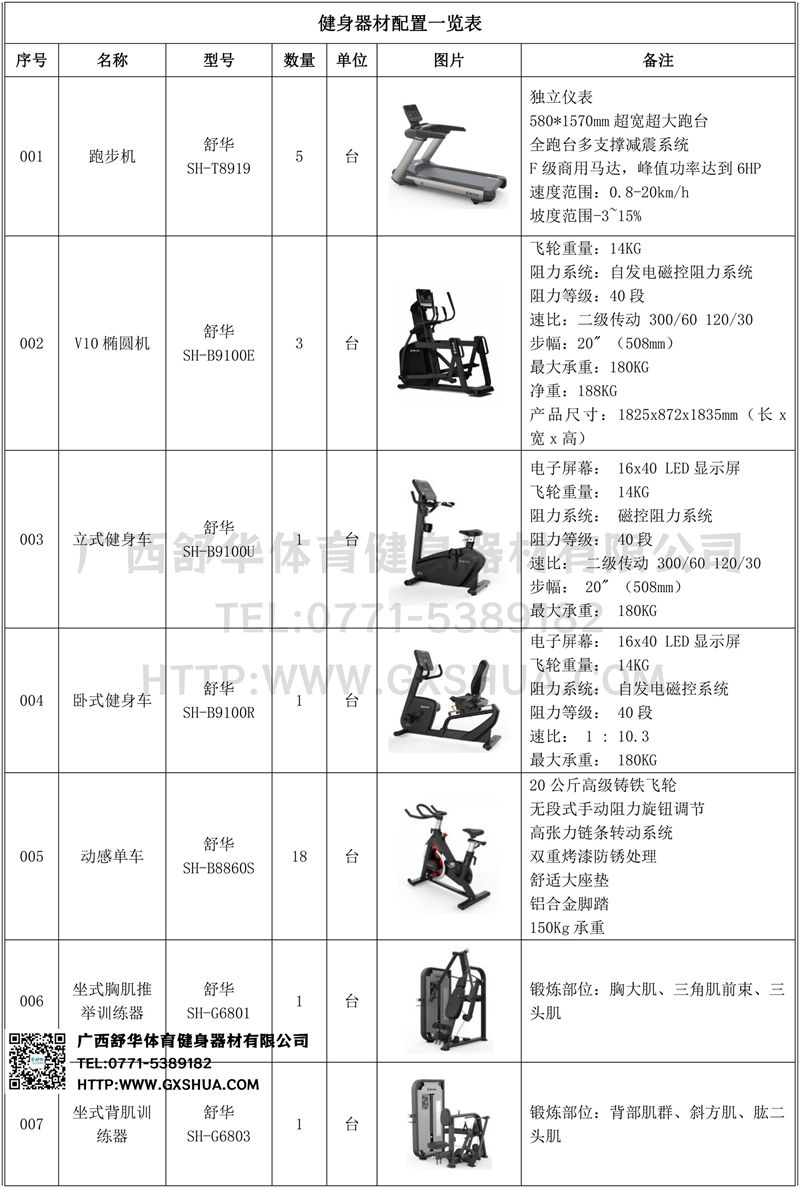 1.米兰V9跑步机SH-T8919*5台-独立仪表-简洁大气,全新外观设计,健康运动新选择;心率监测功能,可通过手握心率、无线心率带等不同方式实时采集心率数据;580*1570mm超宽超大跑台-跑感舒适,跑台整体安全稳定;全跑台多支撑减震平台,保证跑台超强支撑力,达到180kg支撑,满足专业健身房需求。